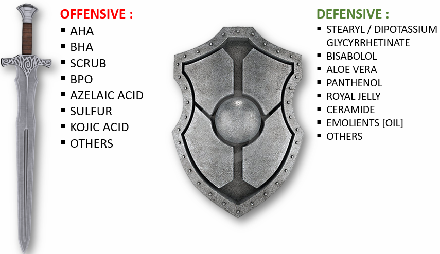 Contoh bahan aktif bersifat Offensive meliputi AHA, BHA, Scrub, Azelaic Acid, Sulfur, Kojic Acid, Tranexamic Acid, dan lainnya.