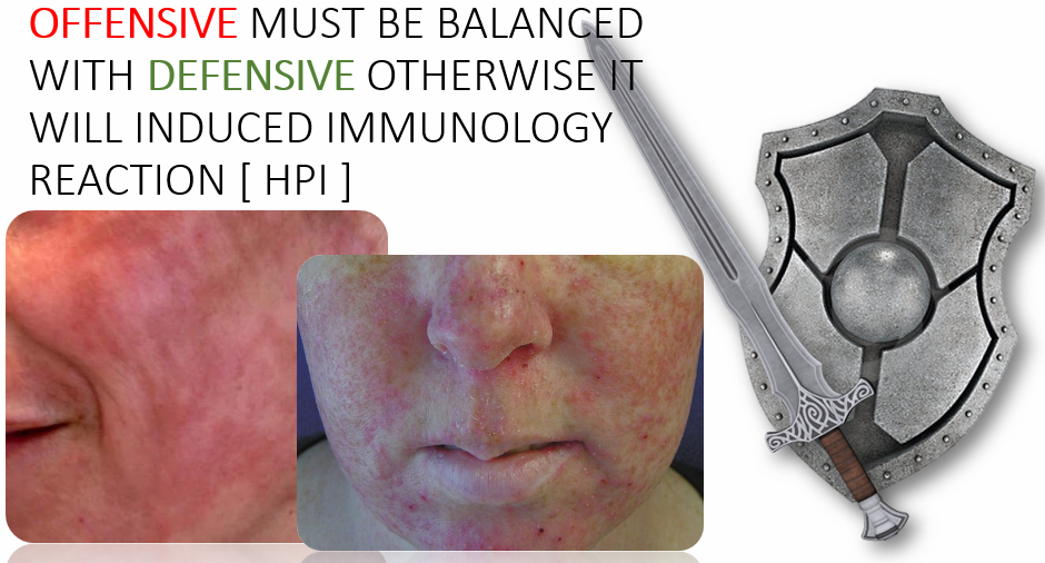 Meskipun Produk Offensive dapat mencerahkan wajah, namun penggunaannya harus mempertimbangkan kondisi Skin Barrier. Karena penggunaan Produk Offensive tanpa disetai Produk Defensive dapat mengikis Skin Barrier dan menyebabkan PIH (Post-Inflammation Hyperpigmentation).